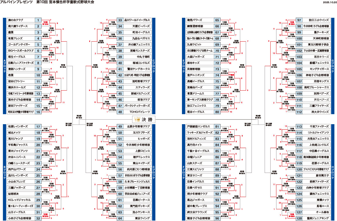 表彰:優勝チームには優勝旗(持ち回り)・優勝杯(持ち回り)・賞状・メダルを授与。準優勝チームには賞状・メダル・準優勝杯を授与。3位のチームには賞状・メダルを授与します。 4位のチームにはメダルを授与します。